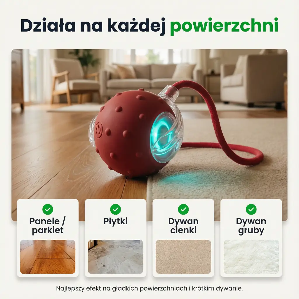 Tak — TurboKula jest stworzona do zabawy na typowych domowych powierzchniach: panelach, płytkach, dywanach i chodnikach. Jeśli masz bardzo wysoki/miękki dywan, najlepiej testować na niższym dywanie lub gładkiej podłodze.